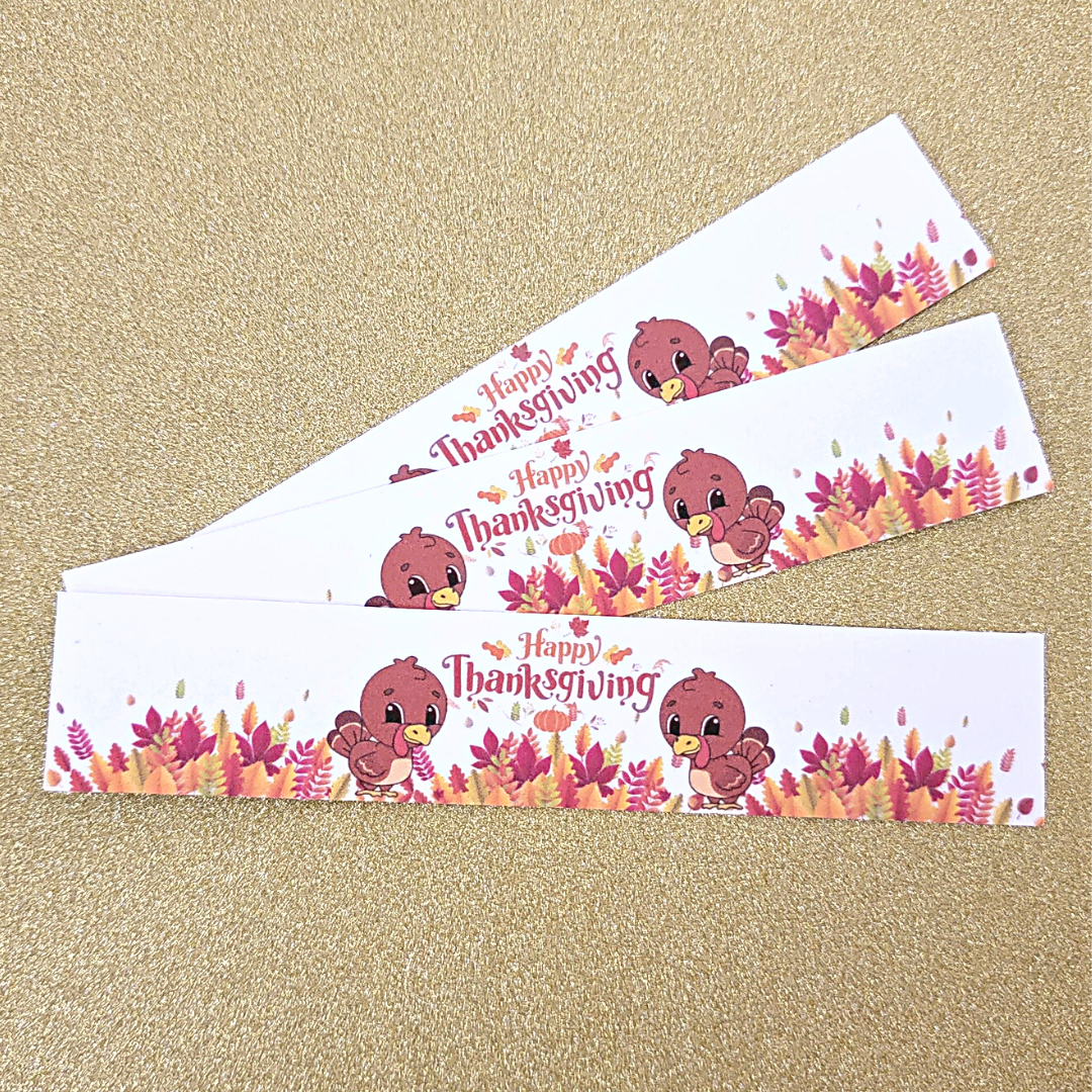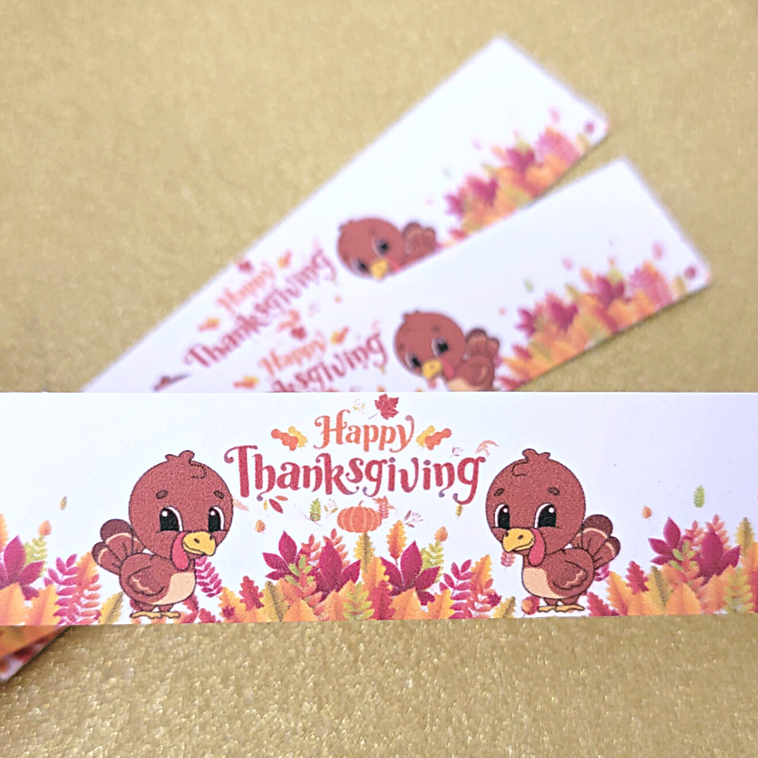 Printed on a matte surface and adorned with traditional fall colors, leaves, and turkeys.