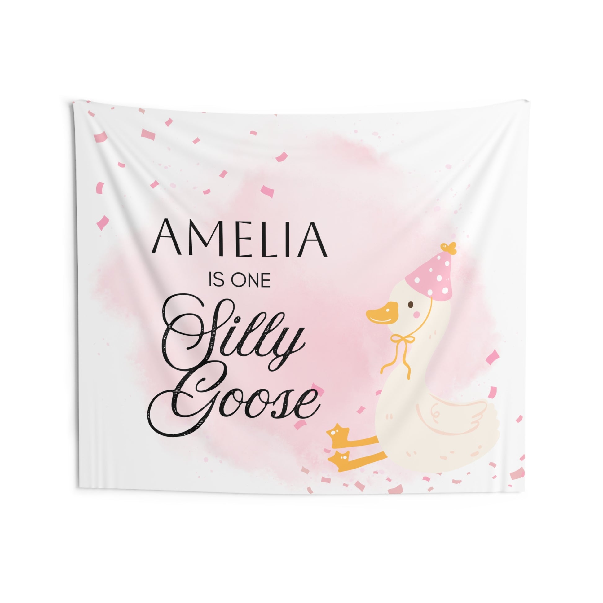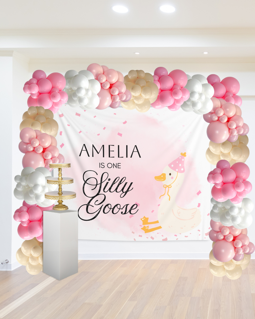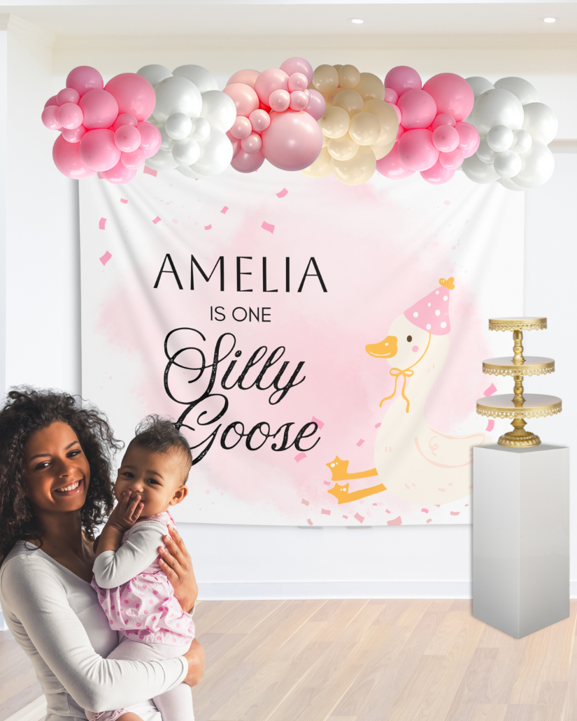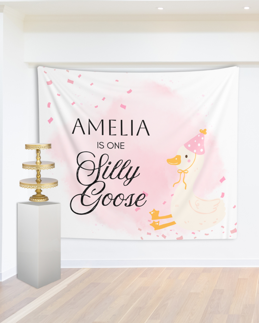 Make decorating your event easy and convenient with this Personalized SIlly Goose Backdrop.